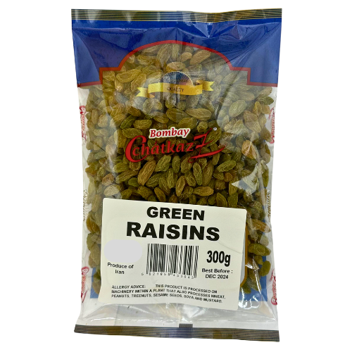Discover Bombay Chatkaz Green Sultanas, a sweet and flavourful addition to your pantry. Perfect for snacking, baking, or adding a touch of sweetness to your favourite Indian dishes. These dried sultanas offer a delightful taste experience for everyday use.