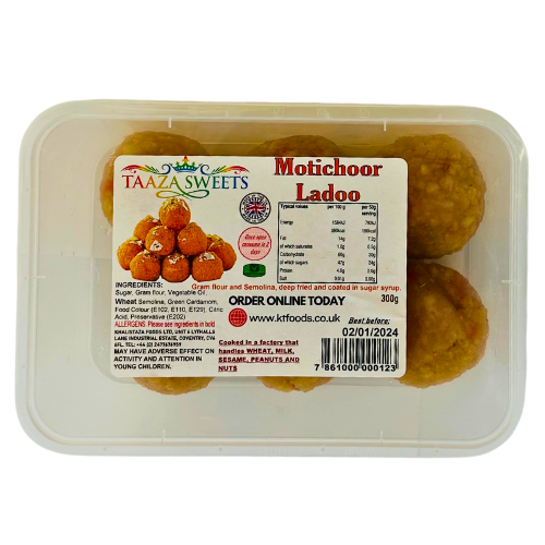 Enjoy the sweet taste of Taaza Motichoor Ladoo, a popular Indian sweet from our Mithai range. These delightful treats are perfect for any occasion, offering a classic taste of India for your enjoyment.